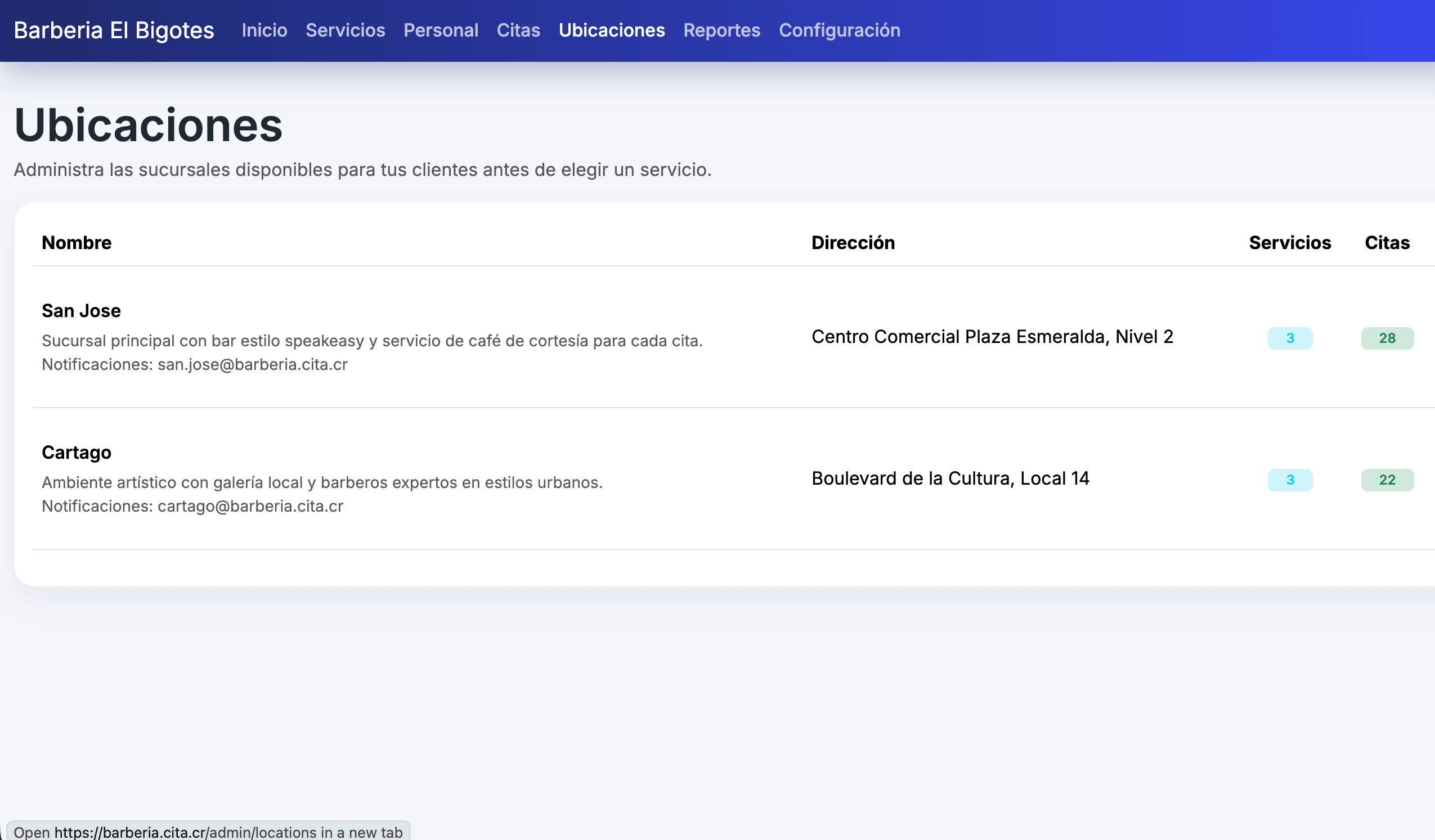 Puede crear su propio subdominio con cita.cr para que sus clientes encuentren fácilmente su aplicación de reservación. Por ejemplo, si su empresa se llama Nación, su subdominio sería nacion.cita.cr. Además, ofrecemos gratis la creación de un código QR imprimible para que sus clientes puedan ingresar fácilmente desde su teléfono.
