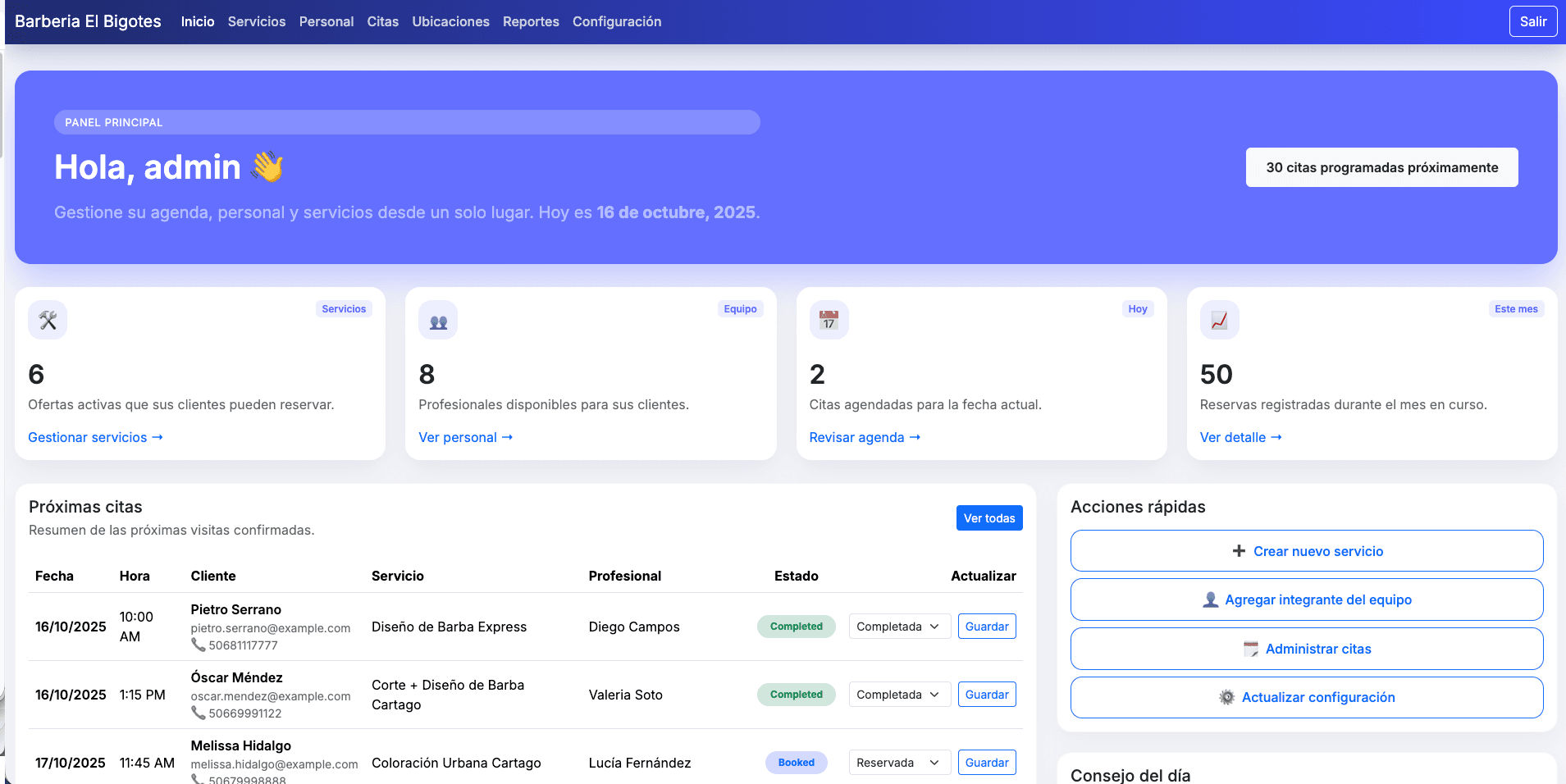 Contamos con una sección de reportería en la cual el administrador puede visualizar el rendimiento de los servicios y todo el proceso del sistema de cita.cr.